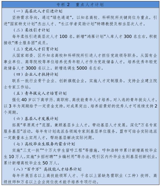 着力抓好高层次创新型领军人才、青年拔尖人才、高技能人才、各类急需紧缺人才队伍建设。实施人才工程计划,选拔推荐全国杰出专业技术人才、政府特殊津贴专家、国家百千万人才工程人选,组织评选自治区杰出人才奖、突出贡献专家、青年创新人才奖,选拔培养自治区“草原英才”工程、新世纪321人才工程、511人才培养工程人选。实施专业技术人才知识更新工程。加强基层专业技术人才队伍建设,引导人才向基层一线和艰苦地区流动。实施“百千万”高技能人才培养计划。