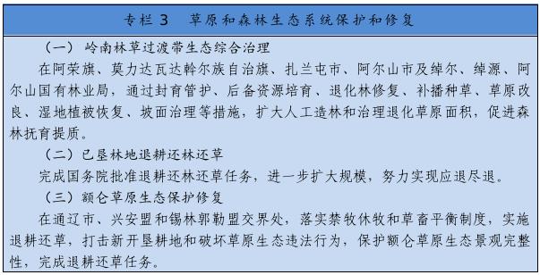 把保护草原、森林作为首要任务,严格执行基本草原保护制度,落实草原生态保护补助奖励ld体育中国官方网站,完善草畜平衡和草原禁牧休牧制度。严禁在草原上乱采滥挖、新上矿产资源开发等工业项目,已批准在建运营的矿山、风电、光伏等项目到期退出,新建风电、光伏电站重点布局在沙漠荒漠、采煤沉陷区、露天矿排土场,推广“光伏+生态治理”基地建设模式。开展草原生态承载能力核定和草原生态系统健康评价,实施草原保护和修复重大工程。科学开展大规模国土绿化行动,实施三北防护林体系建设、公益林保护、森林质量精准提升等工程,探索大兴安岭一体化保护模式,推进已垦森林草原退耕还林还草,加强森林抚育和退化林修复,提升生态系统质量和稳定性。加快构建以国家公园为主体的自然保护地体系。