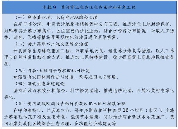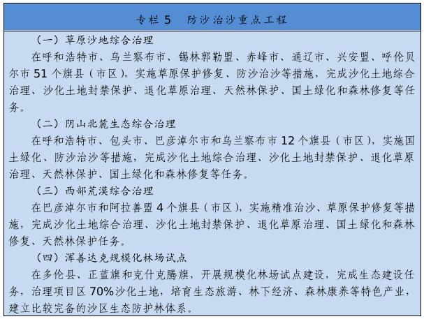 继续实施京津风沙源治理等重点工程,推广库布其沙漠治理方式和沙产业模式,推动浑善达克、乌珠穆沁、呼伦贝尔沙地治理。推进规模化林场建设,采取人工造林、封沙育林、飞播造林等方式恢复植被。建设荒漠绿洲防护林、防风固沙林、沙漠锁边林、农田草牧场防护林以及水土保持林。以干旱半干旱草原为重点,加强草场改良和人工种草,实行围封禁牧、划区轮牧、季节性休牧、舍饲圈养等措施,保护和恢复草原植被。以内蒙古高原等为重点,推进防护林体系建设及退化林修复、退化草原修复、京津风沙源治理。新增水土流失综合治理3.33万平方公里。