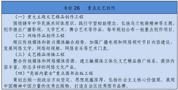 坚持以人民为中心的创作导向,创作生产出人民喜闻乐见的优秀作品。繁荣发展新闻出版、广播影视、文学艺术,实施文艺作品质量提升工程,加强优秀剧本孵化和生活采风。推动重大主题文艺精品创作,加强现实题材创作生产。改进重点作品创作引导机制,建立重点文化艺术项目滚动扶持机制。设立内蒙古文化艺术发展专项资金。加强文化文艺场馆建设。制定文艺人才发展规划,开展内蒙古电影新导演计划。实施文化润心工程,以文艺创作铸牢中华民族共同体意识。提升广播电视和网络视听产品质量,丰富网络文艺内容。搭建文艺精品遴选、展示、推出平台,建设内蒙古音乐厅,支持因地制宜建设综合剧场、音乐厅和美术馆,举办内蒙古艺术节、内蒙古音乐节等活动,大力实施文艺惠民演出和地方戏传承创新工程,定期举办全区地方戏优秀剧目展演以及音乐、舞蹈、小戏小品专业赛事,打造独具特色的文化艺术品牌。